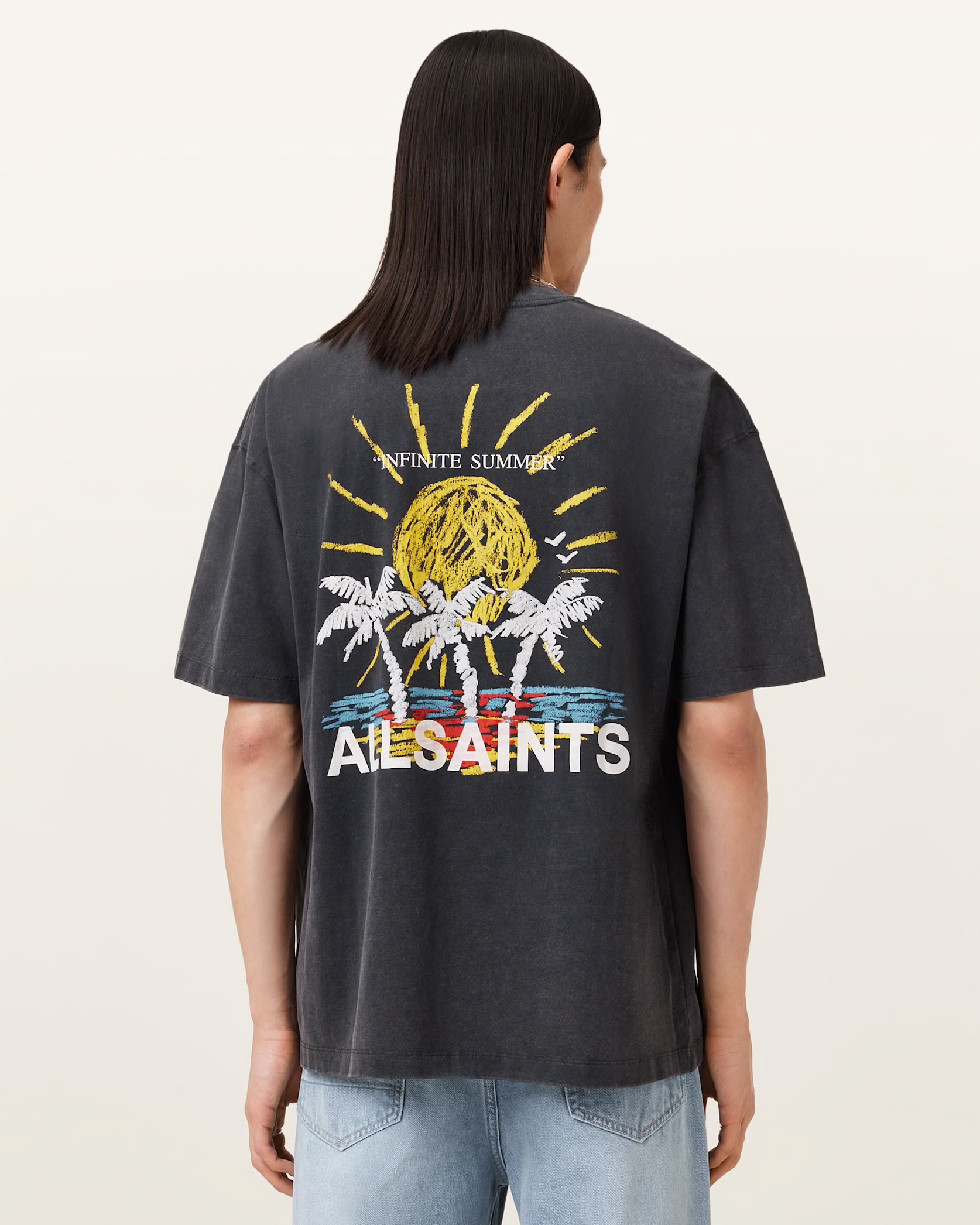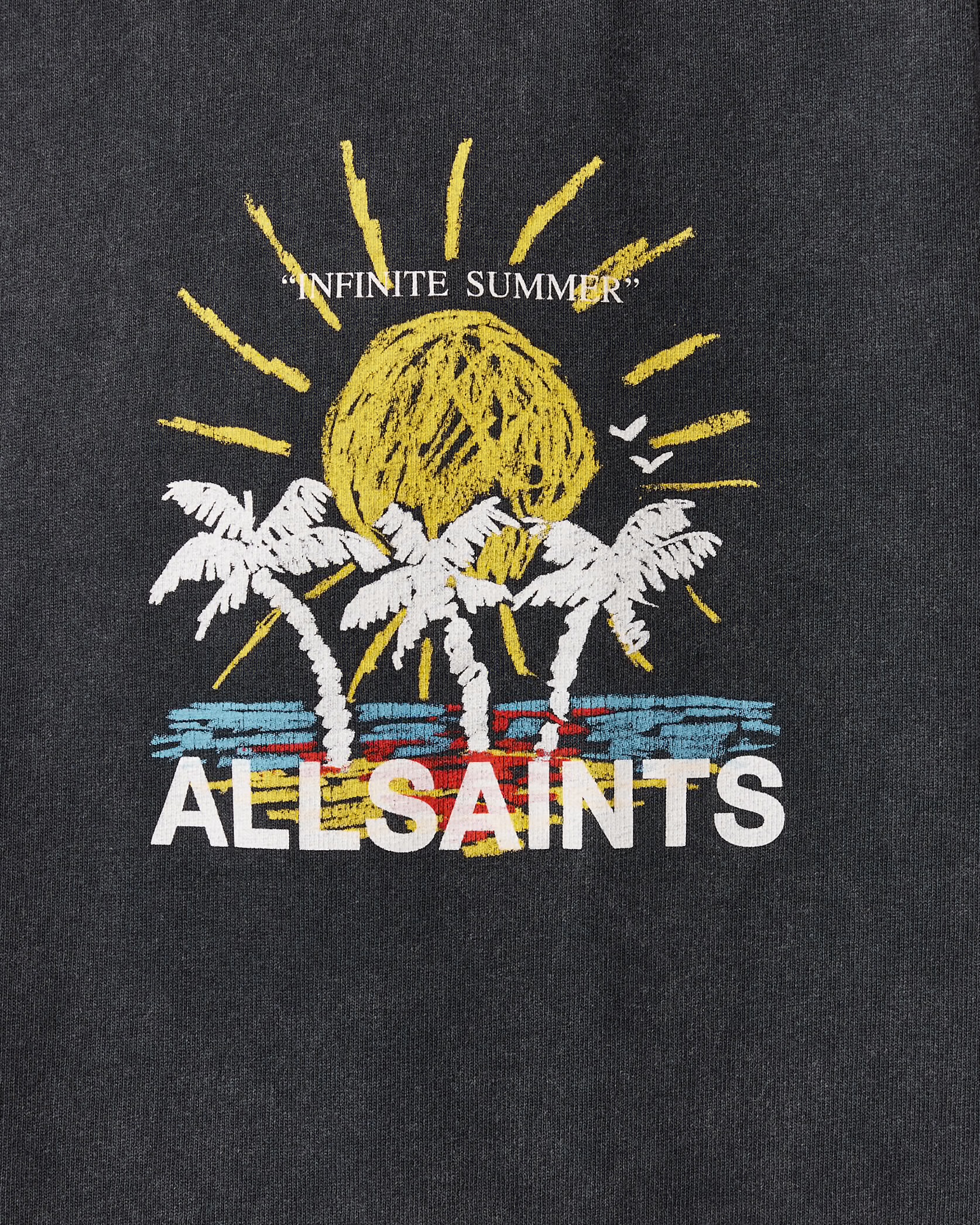 Головний акцент футболки – яскравий принт із зображенням сонця, пальм і написом ” Infinite Summer”, розташований на спині та у зменшеному варіанті на грудях. Це символ нескінченного літа, відпочинку та свободи. Логотип Allsaints виконаний контрастними кольорами, що додає енергії та робить дизайн впізнаваним.
