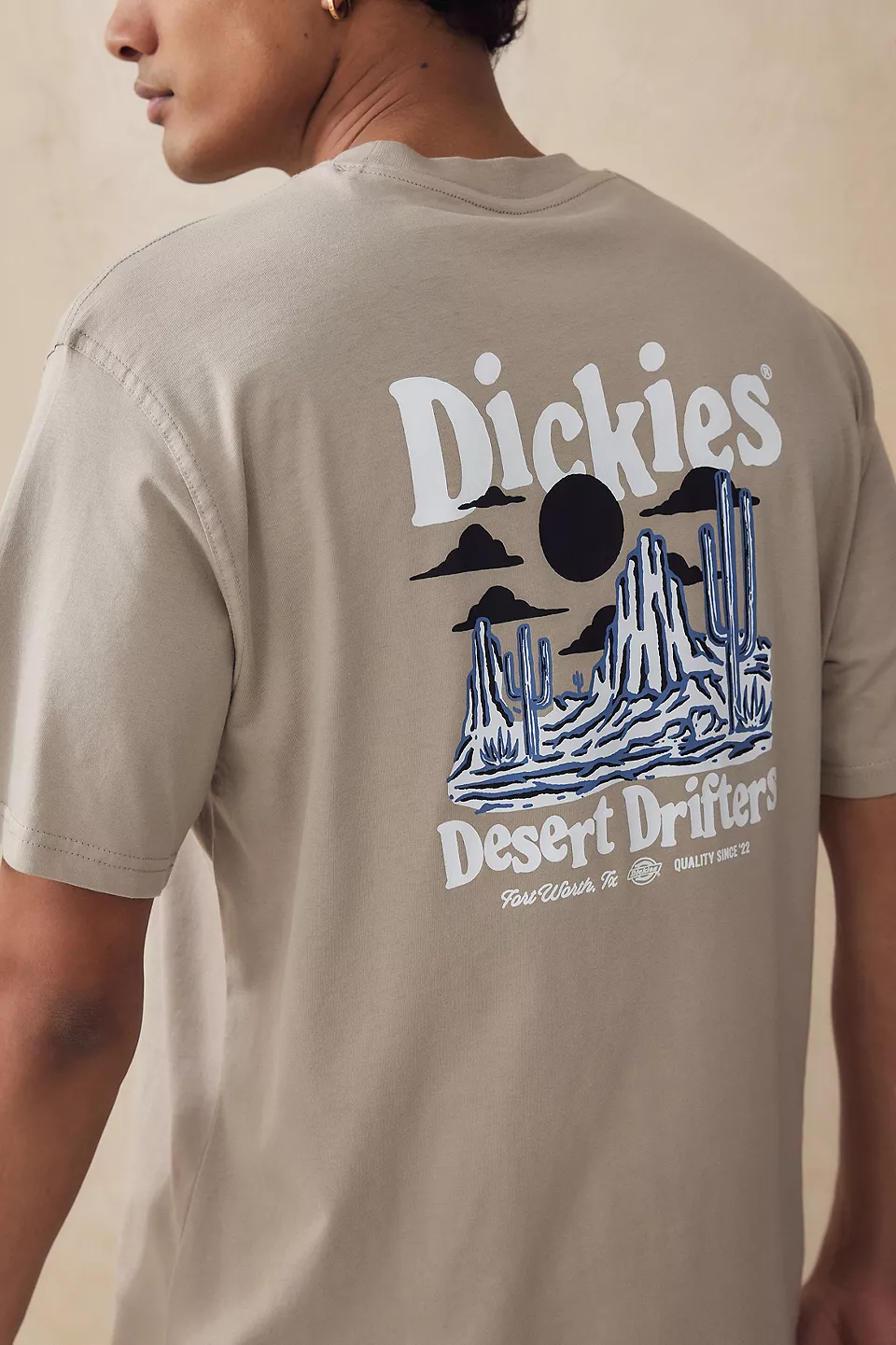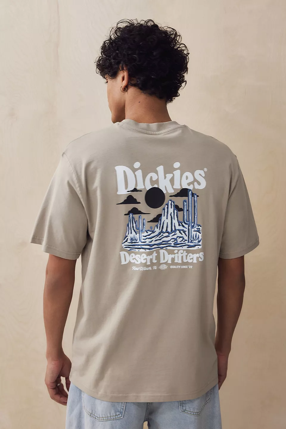 Масштабний принт з логотипом Dickies та мальовничим пейзажем пустелі, скель та кактусів. Напис “Desert Drifters” додає моделі характеру, роблячи її не просто базовим одягом, а повноцінною заявою про стиль.