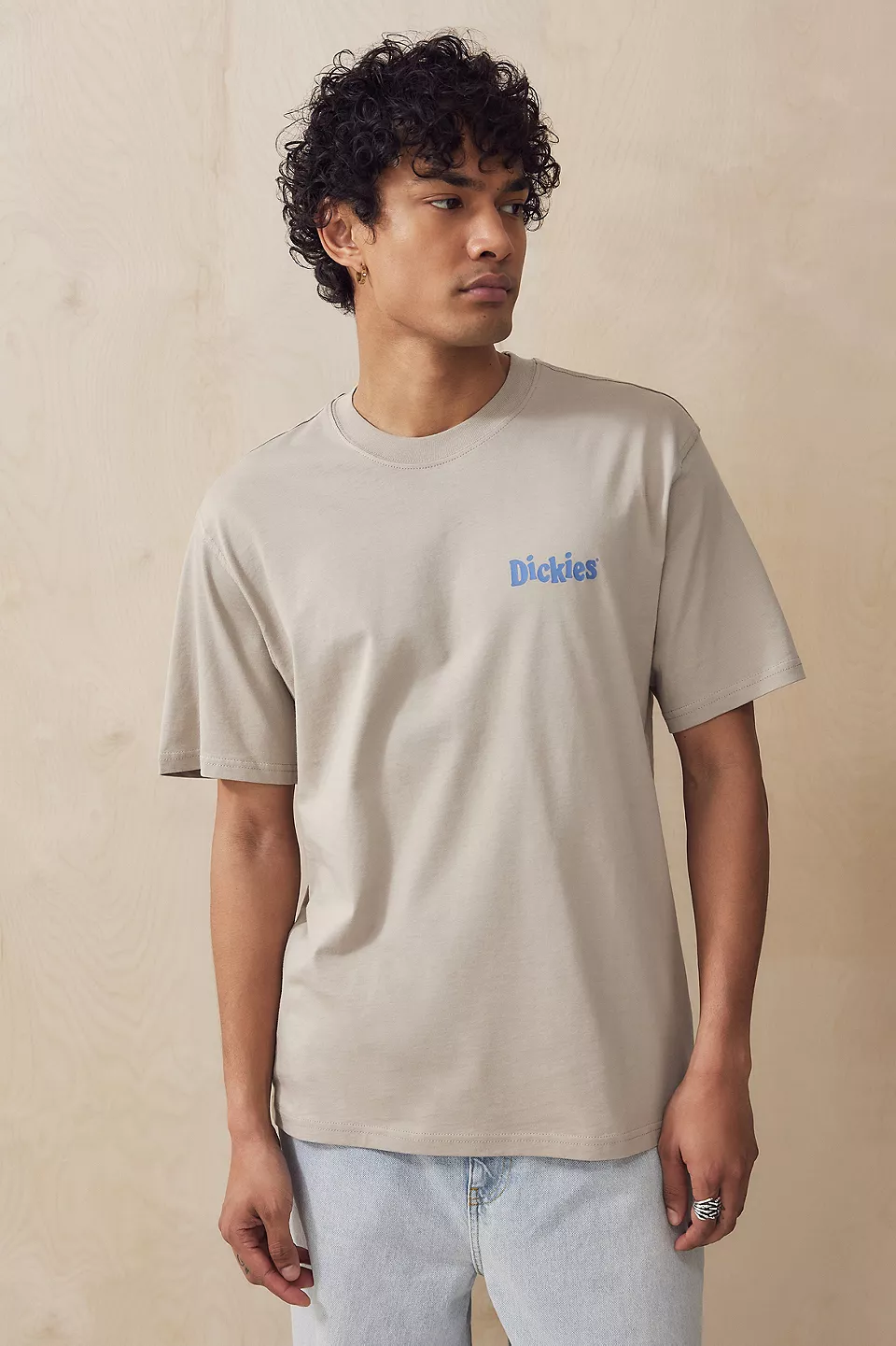 Мінімалістичний напис Dickies на грудях у контрастному синьому кольорі, що гармоніює з елементами основного принта на спині.